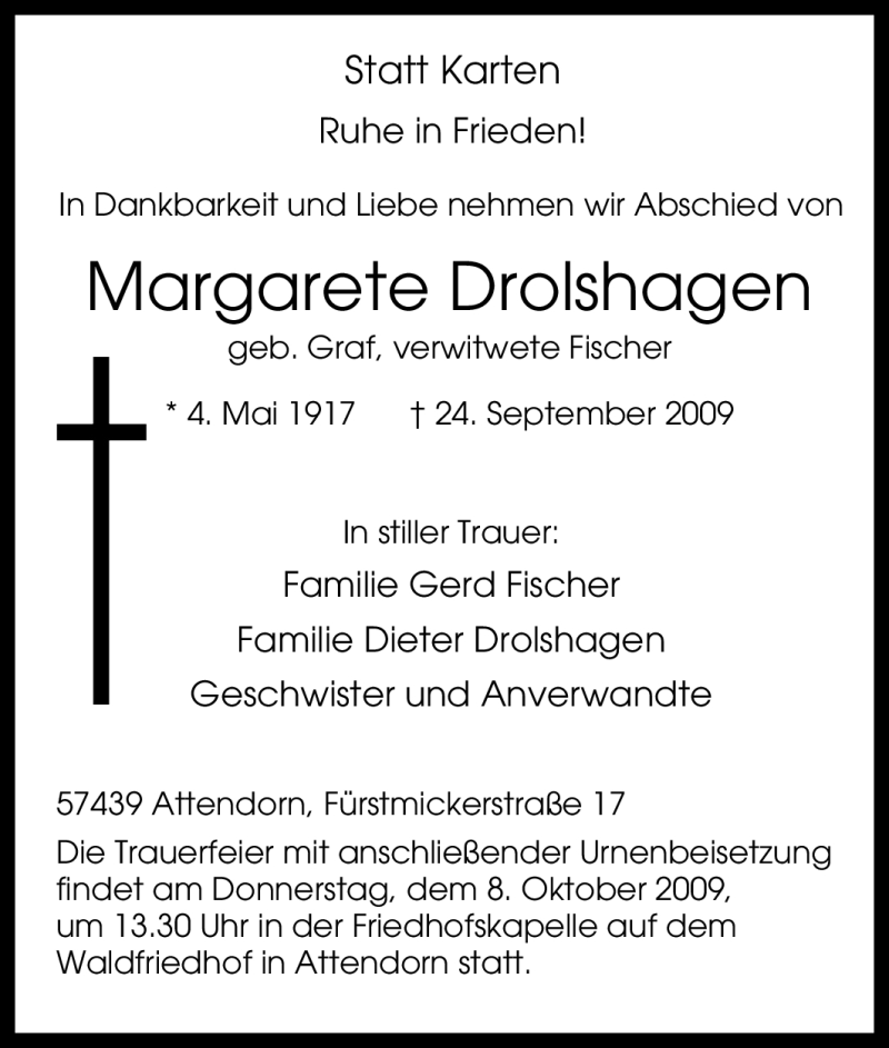 Hier finden Sie alle Traueranzeigen aus der Zeitung, die bisher für Margarete Drolshagen erschienen sind. Weitere Traueranzeigen, die in der Zeitung erscheinen, werden hier ebenfalls aufgelistet