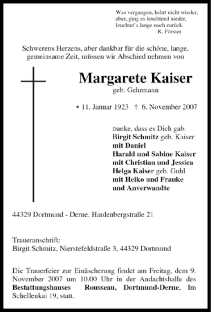 Hier finden Sie alle Traueranzeigen aus der Zeitung, die bisher für Margarete Kaiser erschienen sind. Weitere Traueranzeigen, die in der Zeitung erscheinen, werden hier ebenfalls aufgelistet