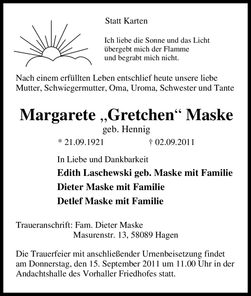 Hier finden Sie alle Traueranzeigen aus der Zeitung, die bisher für Margarete Gretchen Maske erschienen sind. Weitere Traueranzeigen, die in der Zeitung erscheinen, werden hier ebenfalls aufgelistet