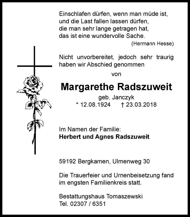 Hier finden Sie alle Traueranzeigen aus der Zeitung, die bisher für Margarethe Radszuweit erschienen sind. Weitere Traueranzeigen, die in der Zeitung erscheinen, werden hier ebenfalls aufgelistet