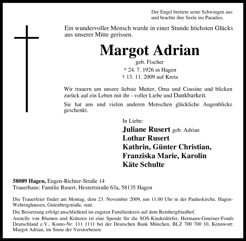 Hier finden Sie alle Traueranzeigen aus der Zeitung, die bisher für Margot Adrian erschienen sind. Weitere Traueranzeigen, die in der Zeitung erscheinen, werden hier ebenfalls aufgelistet
