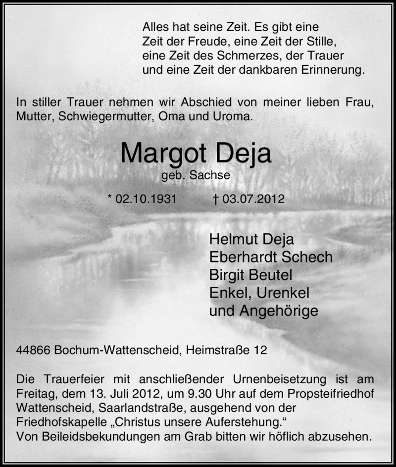 Hier finden Sie alle Traueranzeigen aus der Zeitung, die bisher für Margot Deja erschienen sind. Weitere Traueranzeigen, die in der Zeitung erscheinen, werden hier ebenfalls aufgelistet
