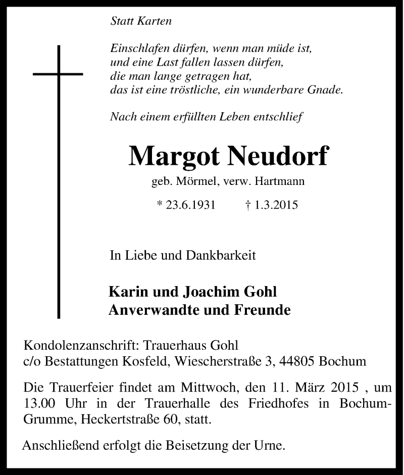 Hier finden Sie alle Traueranzeigen aus der Zeitung, die bisher für Margot Neudorf erschienen sind. Weitere Traueranzeigen, die in der Zeitung erscheinen, werden hier ebenfalls aufgelistet