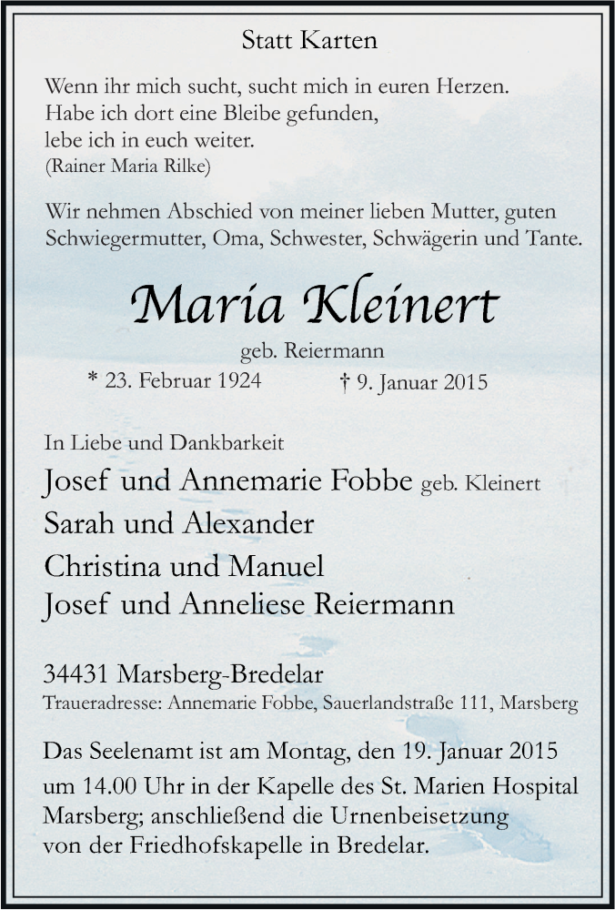 Hier finden Sie alle Traueranzeigen aus der Zeitung, die bisher für Maria Kleinert erschienen sind. Weitere Traueranzeigen, die in der Zeitung erscheinen, werden hier ebenfalls aufgelistet