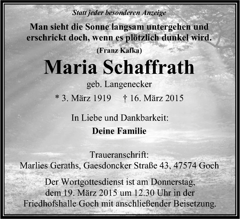 Hier finden Sie alle Traueranzeigen aus der Zeitung, die bisher für Maria Schaffrath erschienen sind. Weitere Traueranzeigen, die in der Zeitung erscheinen, werden hier ebenfalls aufgelistet