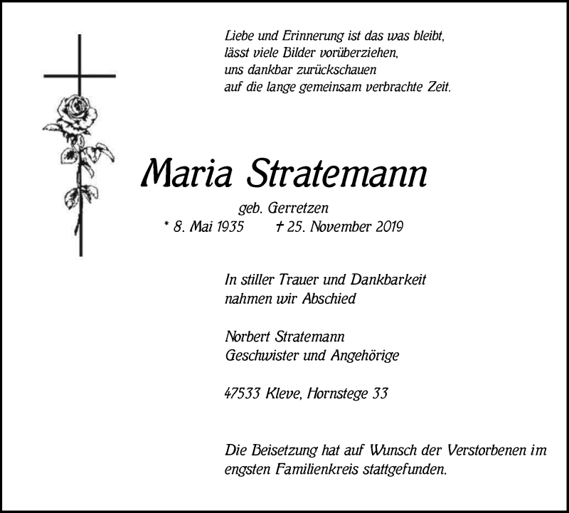 Hier finden Sie alle Traueranzeigen aus der Zeitung, die bisher für Maria Stratemann erschienen sind. Weitere Traueranzeigen, die in der Zeitung erscheinen, werden hier ebenfalls aufgelistet