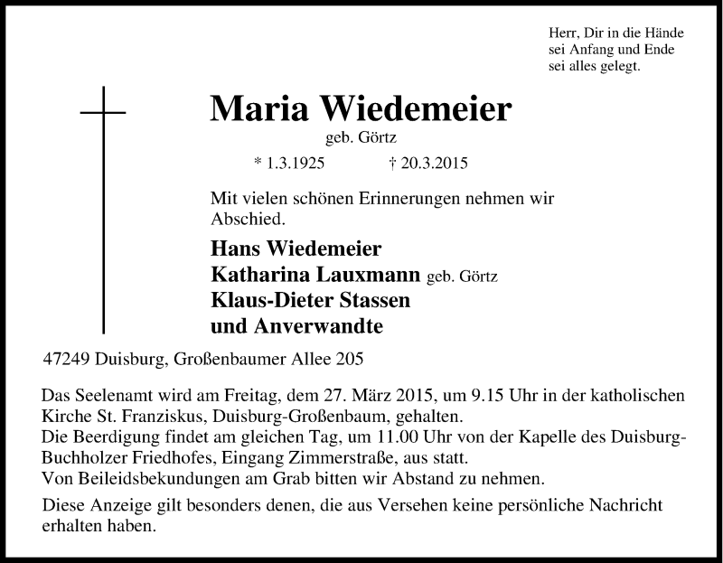Hier finden Sie alle Traueranzeigen aus der Zeitung, die bisher für Maria Wiedemeier erschienen sind. Weitere Traueranzeigen, die in der Zeitung erscheinen, werden hier ebenfalls aufgelistet
