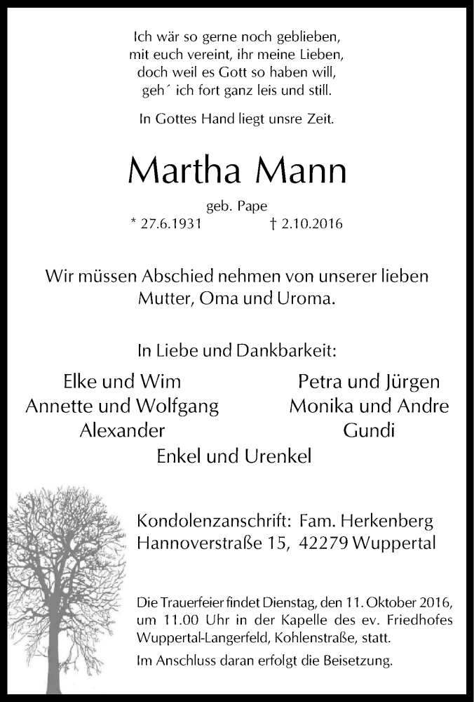 Hier finden Sie alle Traueranzeigen aus der Zeitung, die bisher für Martha Mann erschienen sind. Weitere Traueranzeigen, die in der Zeitung erscheinen, werden hier ebenfalls aufgelistet