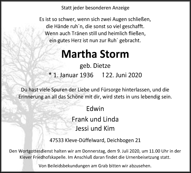 Hier finden Sie alle Traueranzeigen aus der Zeitung, die bisher für Martha Storm erschienen sind. Weitere Traueranzeigen, die in der Zeitung erscheinen, werden hier ebenfalls aufgelistet