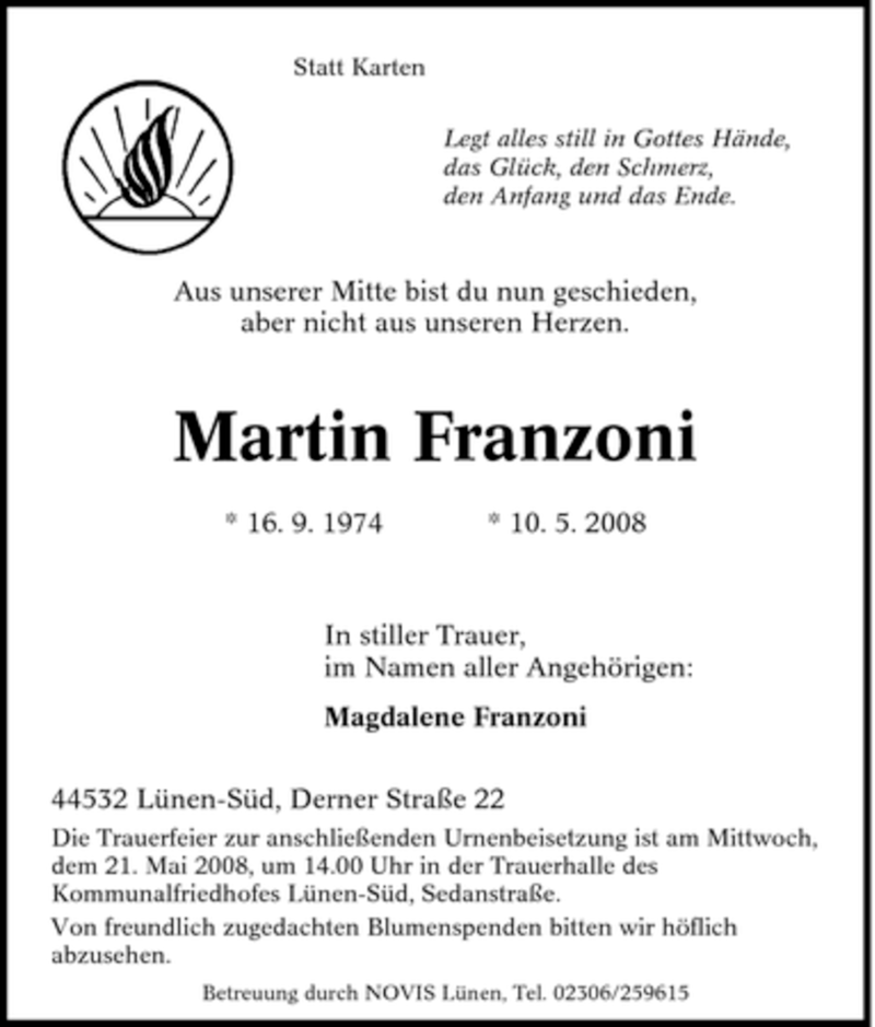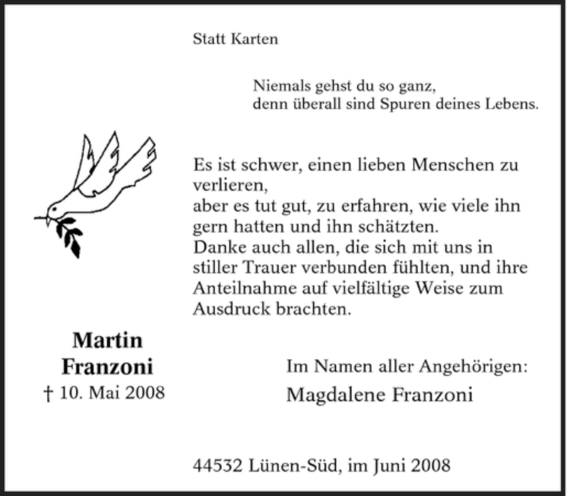 Hier finden Sie alle Traueranzeigen aus der Zeitung, die bisher für Martin Franzoni erschienen sind. Weitere Traueranzeigen, die in der Zeitung erscheinen, werden hier ebenfalls aufgelistet