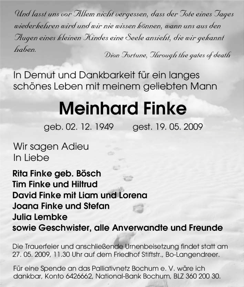 Hier finden Sie alle Traueranzeigen aus der Zeitung, die bisher für Meinhard Finke erschienen sind. Weitere Traueranzeigen, die in der Zeitung erscheinen, werden hier ebenfalls aufgelistet