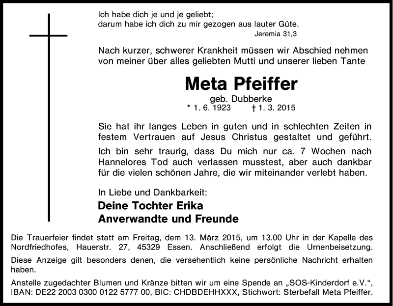 Hier finden Sie alle Traueranzeigen aus der Zeitung, die bisher für Meta Pfeiffer erschienen sind. Weitere Traueranzeigen, die in der Zeitung erscheinen, werden hier ebenfalls aufgelistet