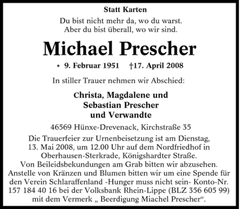Hier finden Sie alle Traueranzeigen aus der Zeitung, die bisher für Michael Prescher erschienen sind. Weitere Traueranzeigen, die in der Zeitung erscheinen, werden hier ebenfalls aufgelistet