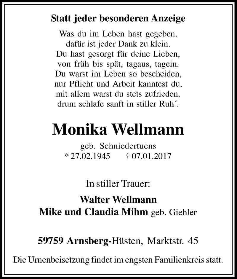 Hier finden Sie alle Traueranzeigen aus der Zeitung, die bisher für Monika Wellmann erschienen sind. Weitere Traueranzeigen, die in der Zeitung erscheinen, werden hier ebenfalls aufgelistet