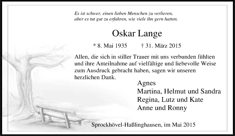 Hier finden Sie alle Traueranzeigen aus der Zeitung, die bisher für Oskar Lange erschienen sind. Weitere Traueranzeigen, die in der Zeitung erscheinen, werden hier ebenfalls aufgelistet