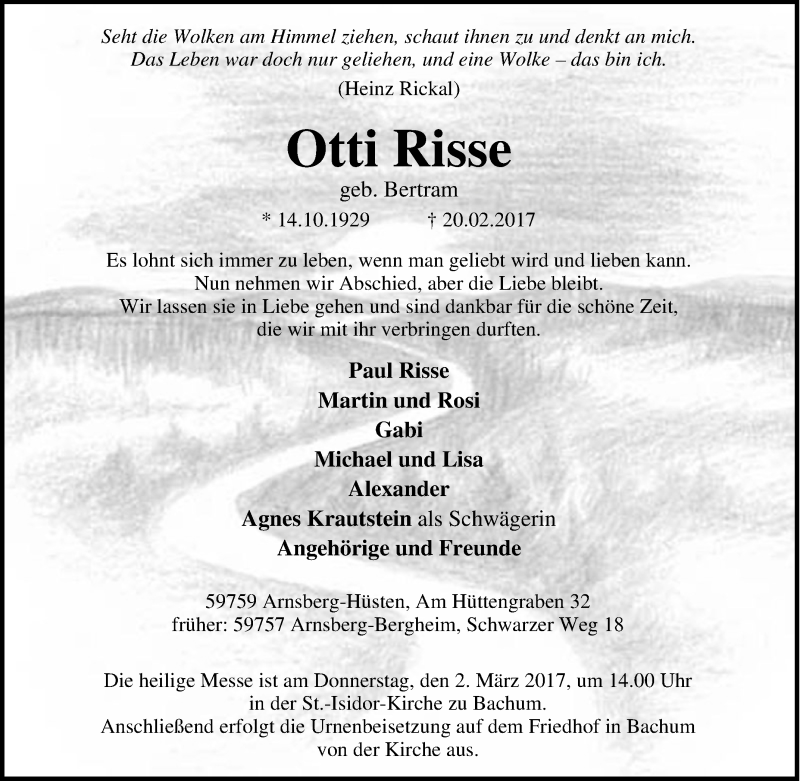 Hier finden Sie alle Traueranzeigen aus der Zeitung, die bisher für Otti Risse erschienen sind. Weitere Traueranzeigen, die in der Zeitung erscheinen, werden hier ebenfalls aufgelistet