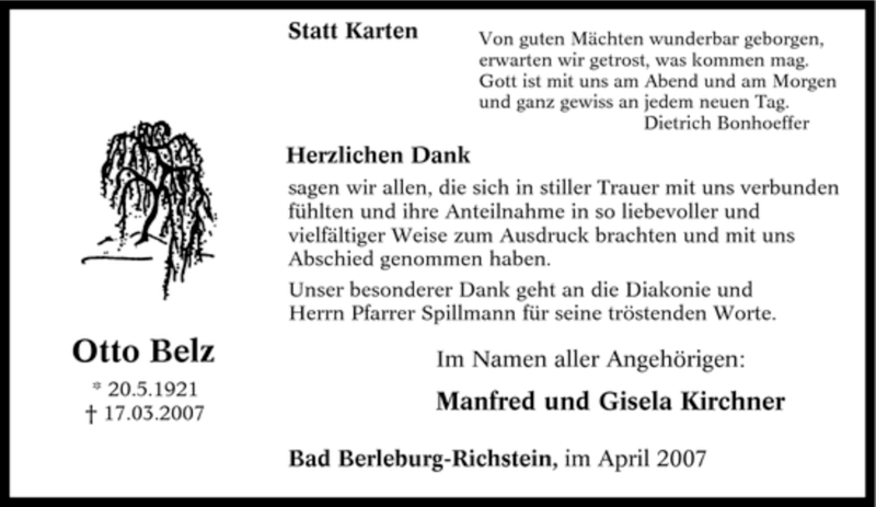 Hier finden Sie alle Traueranzeigen aus der Zeitung, die bisher für Otto Belz erschienen sind. Weitere Traueranzeigen, die in der Zeitung erscheinen, werden hier ebenfalls aufgelistet