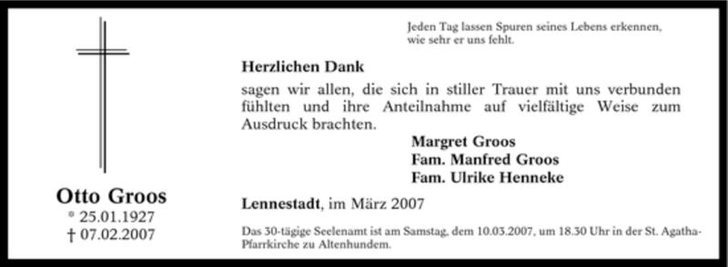 Hier finden Sie alle Traueranzeigen aus der Zeitung, die bisher für Otto Groos erschienen sind. Weitere Traueranzeigen, die in der Zeitung erscheinen, werden hier ebenfalls aufgelistet