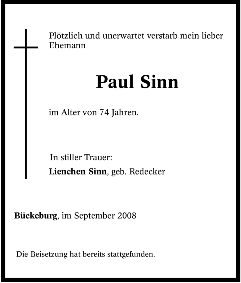 Hier finden Sie alle Traueranzeigen aus der Zeitung, die bisher für Paul Sinn erschienen sind. Weitere Traueranzeigen, die in der Zeitung erscheinen, werden hier ebenfalls aufgelistet