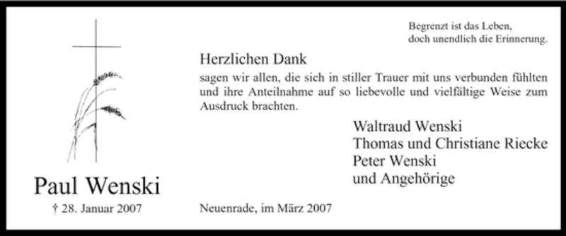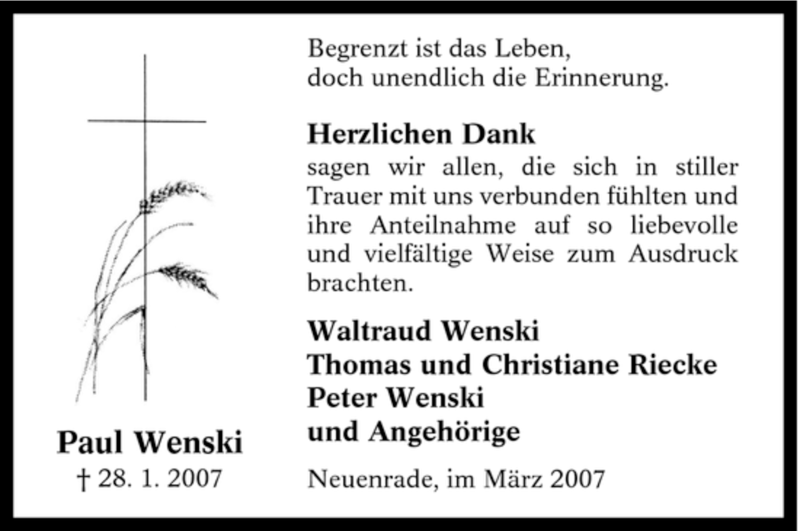 Hier finden Sie alle Traueranzeigen aus der Zeitung, die bisher für Paul Wenski erschienen sind. Weitere Traueranzeigen, die in der Zeitung erscheinen, werden hier ebenfalls aufgelistet