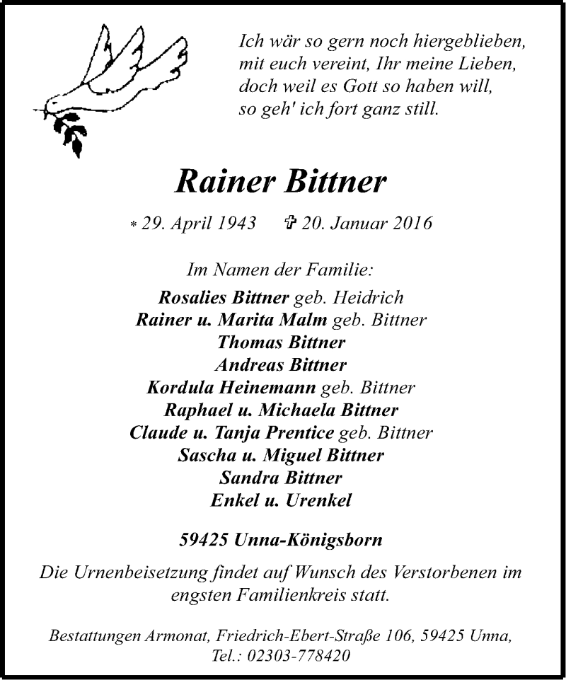 Hier finden Sie alle Traueranzeigen aus der Zeitung, die bisher für Rainer Bittner erschienen sind. Weitere Traueranzeigen, die in der Zeitung erscheinen, werden hier ebenfalls aufgelistet