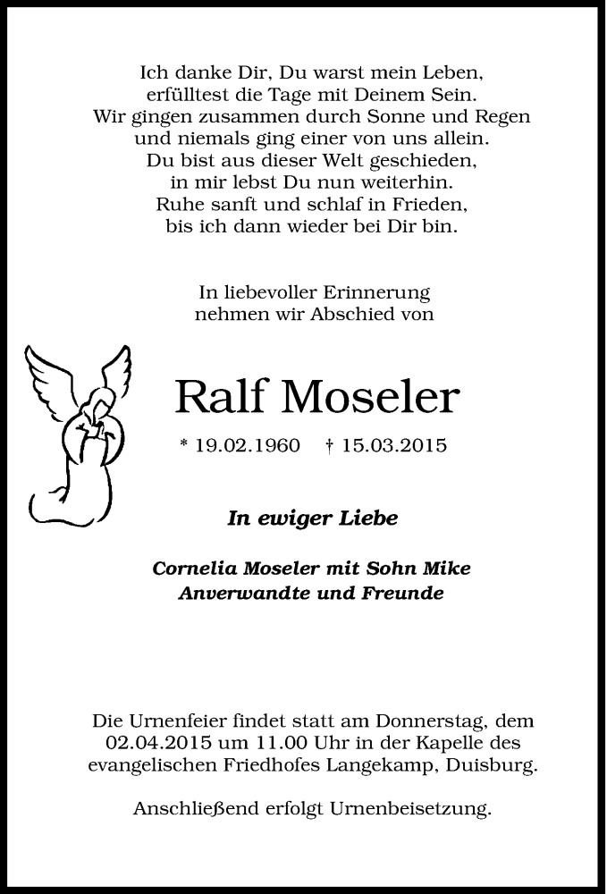 Hier finden Sie alle Traueranzeigen aus der Zeitung, die bisher für Ralf Moseler erschienen sind. Weitere Traueranzeigen, die in der Zeitung erscheinen, werden hier ebenfalls aufgelistet