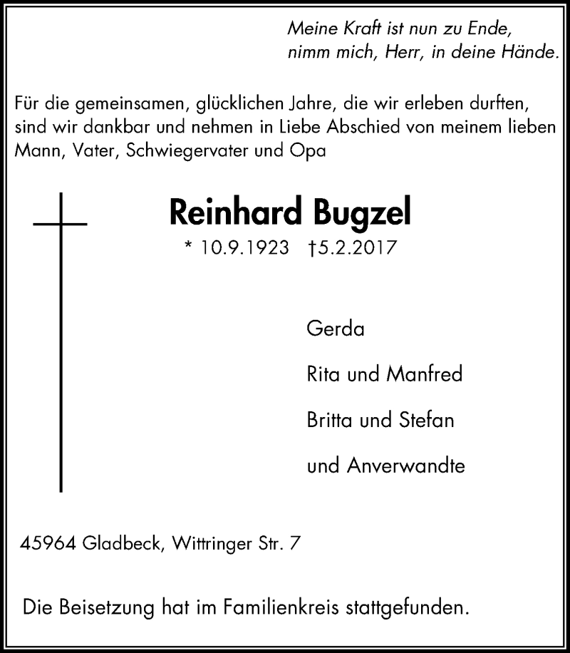 Hier finden Sie alle Traueranzeigen aus der Zeitung, die bisher für Reinhard Bugzel erschienen sind. Weitere Traueranzeigen, die in der Zeitung erscheinen, werden hier ebenfalls aufgelistet