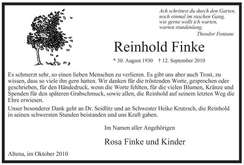 Hier finden Sie alle Traueranzeigen aus der Zeitung, die bisher für Reinhold Finke erschienen sind. Weitere Traueranzeigen, die in der Zeitung erscheinen, werden hier ebenfalls aufgelistet