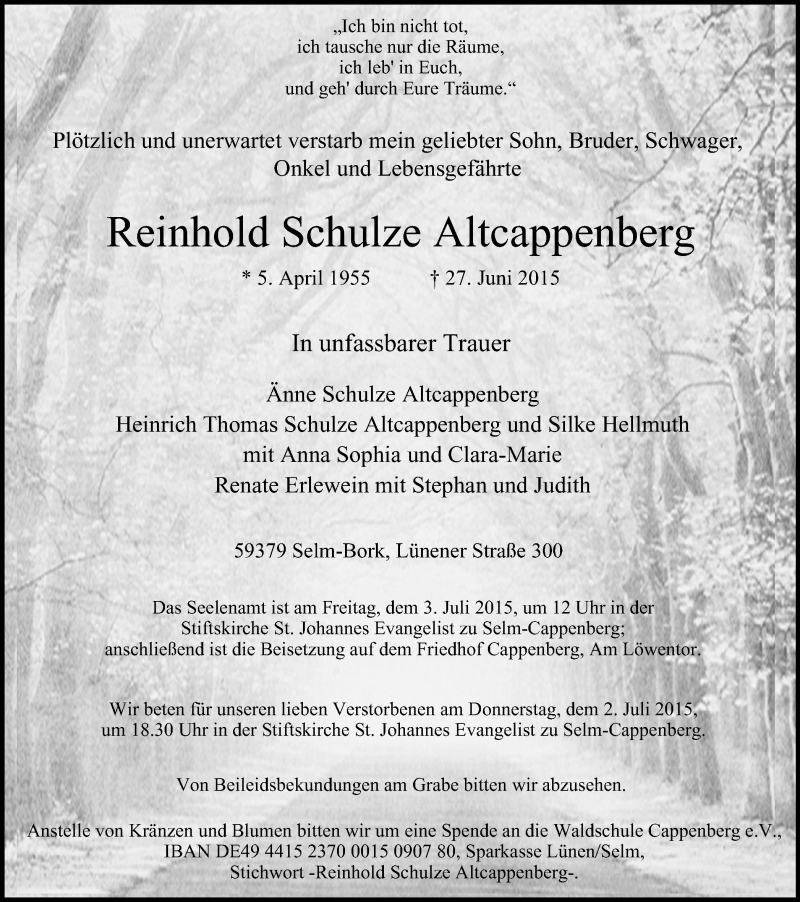 Hier finden Sie alle Traueranzeigen aus der Zeitung, die bisher für Reinhold Schulze erschienen sind. Weitere Traueranzeigen, die in der Zeitung erscheinen, werden hier ebenfalls aufgelistet
