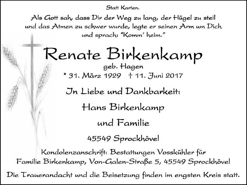 Hier finden Sie alle Traueranzeigen aus der Zeitung, die bisher für Renate Birkenkamp erschienen sind. Weitere Traueranzeigen, die in der Zeitung erscheinen, werden hier ebenfalls aufgelistet
