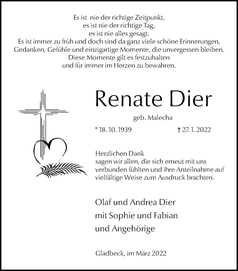 Hier finden Sie alle Traueranzeigen aus der Zeitung, die bisher für Renate Dier erschienen sind. Weitere Traueranzeigen, die in der Zeitung erscheinen, werden hier ebenfalls aufgelistet