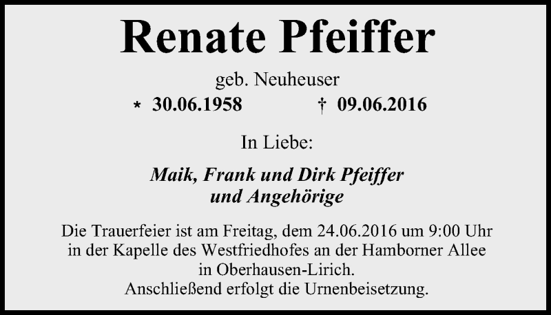 Hier finden Sie alle Traueranzeigen aus der Zeitung, die bisher für Renate Pfeiffer erschienen sind. Weitere Traueranzeigen, die in der Zeitung erscheinen, werden hier ebenfalls aufgelistet