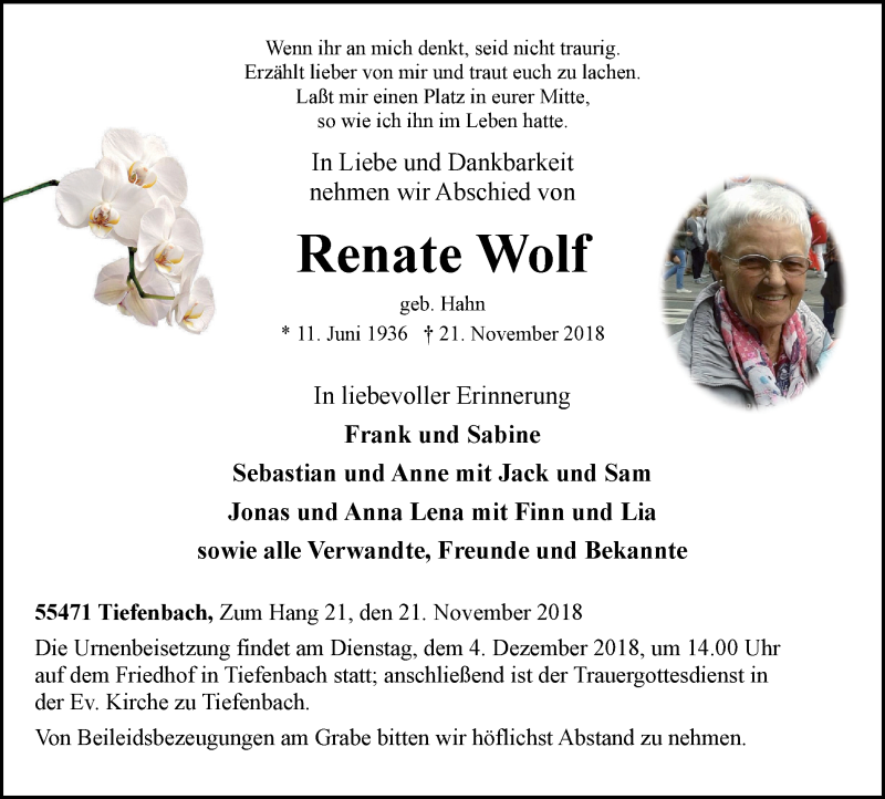 Hier finden Sie alle Traueranzeigen aus der Zeitung, die bisher für Renate Wolf erschienen sind. Weitere Traueranzeigen, die in der Zeitung erscheinen, werden hier ebenfalls aufgelistet