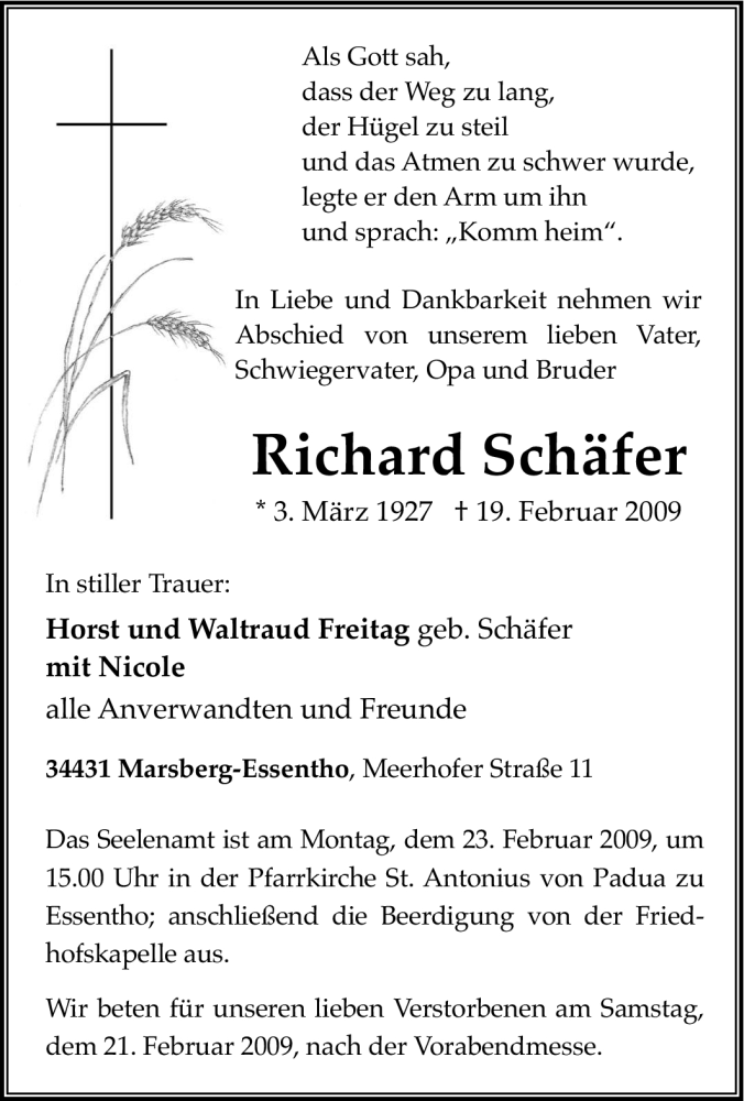 Hier finden Sie alle Traueranzeigen aus der Zeitung, die bisher für Richard Schäfer erschienen sind. Weitere Traueranzeigen, die in der Zeitung erscheinen, werden hier ebenfalls aufgelistet
