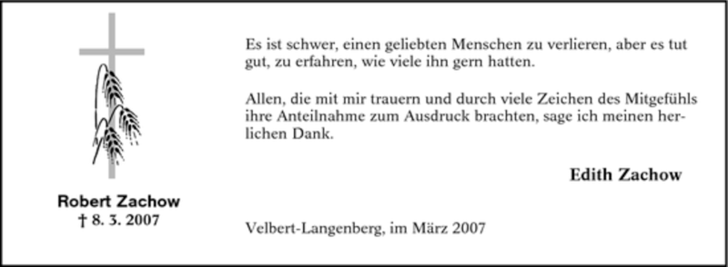 Hier finden Sie alle Traueranzeigen aus der Zeitung, die bisher für Robert Zachow erschienen sind. Weitere Traueranzeigen, die in der Zeitung erscheinen, werden hier ebenfalls aufgelistet