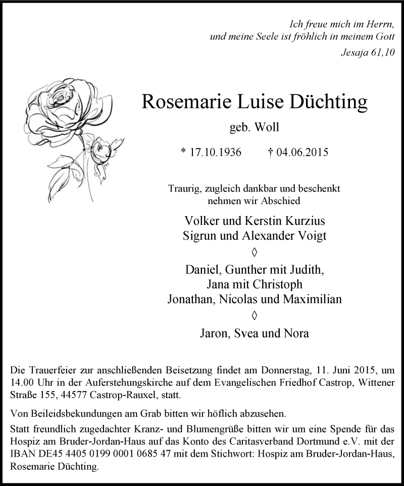 Hier finden Sie alle Traueranzeigen aus der Zeitung, die bisher für Rosemarie Luise Düchting erschienen sind. Weitere Traueranzeigen, die in der Zeitung erscheinen, werden hier ebenfalls aufgelistet