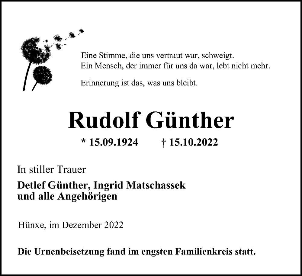 Hier finden Sie alle Traueranzeigen aus der Zeitung, die bisher für Rudolf Günther erschienen sind. Weitere Traueranzeigen, die in der Zeitung erscheinen, werden hier ebenfalls aufgelistet