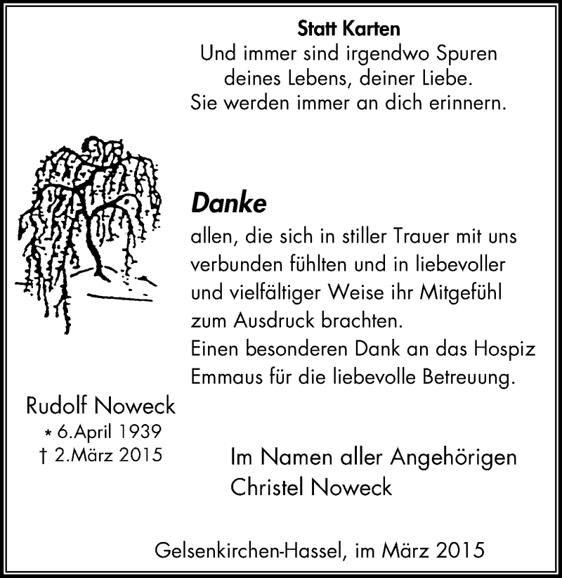 Hier finden Sie alle Traueranzeigen aus der Zeitung, die bisher für Rudolf Noweck erschienen sind. Weitere Traueranzeigen, die in der Zeitung erscheinen, werden hier ebenfalls aufgelistet