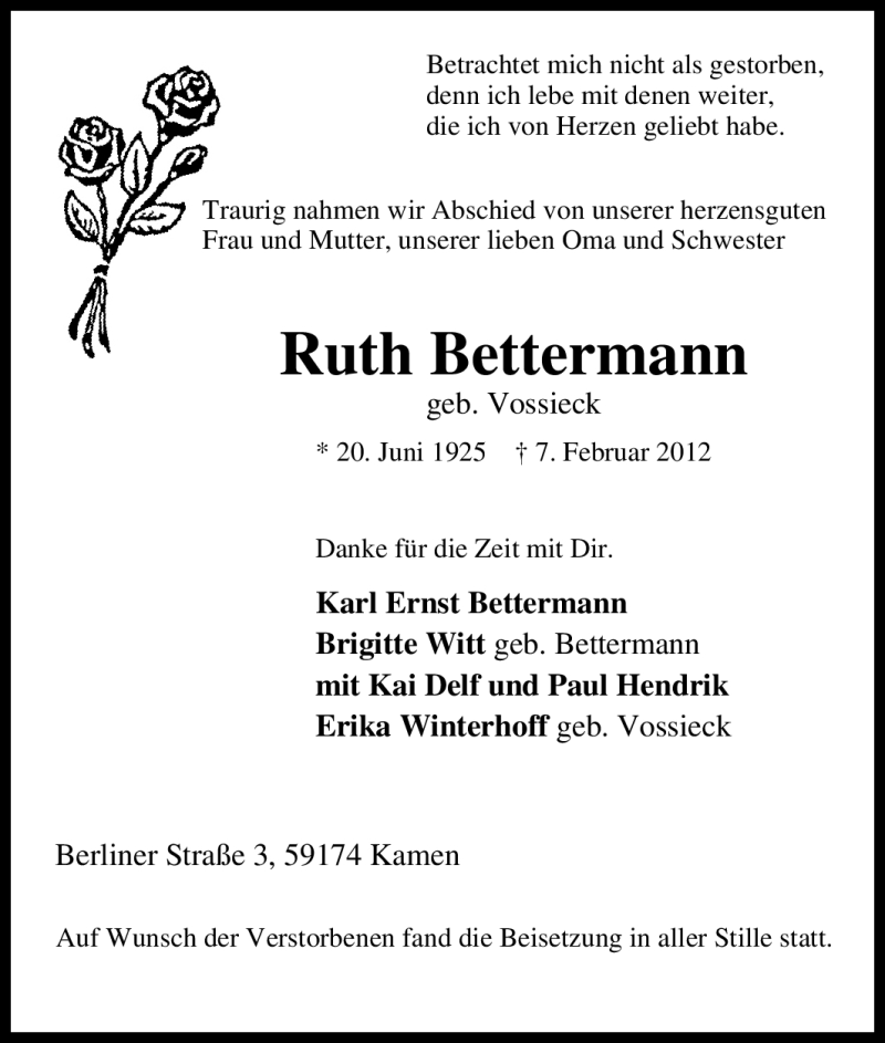 Hier finden Sie alle Traueranzeigen aus der Zeitung, die bisher für Ruth Bettermann erschienen sind. Weitere Traueranzeigen, die in der Zeitung erscheinen, werden hier ebenfalls aufgelistet
