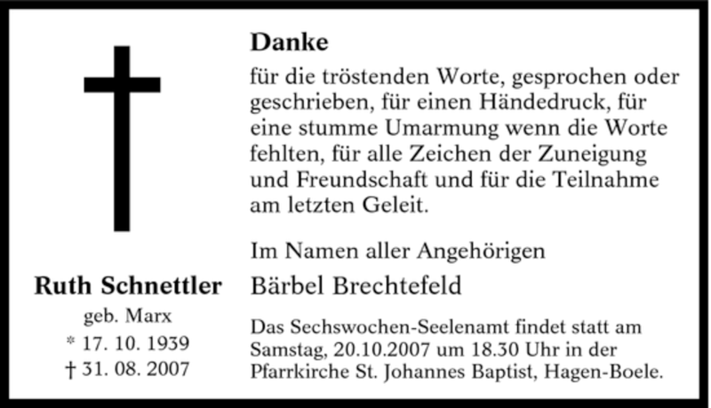 Hier finden Sie alle Traueranzeigen aus der Zeitung, die bisher für Ruth Schnettler erschienen sind. Weitere Traueranzeigen, die in der Zeitung erscheinen, werden hier ebenfalls aufgelistet