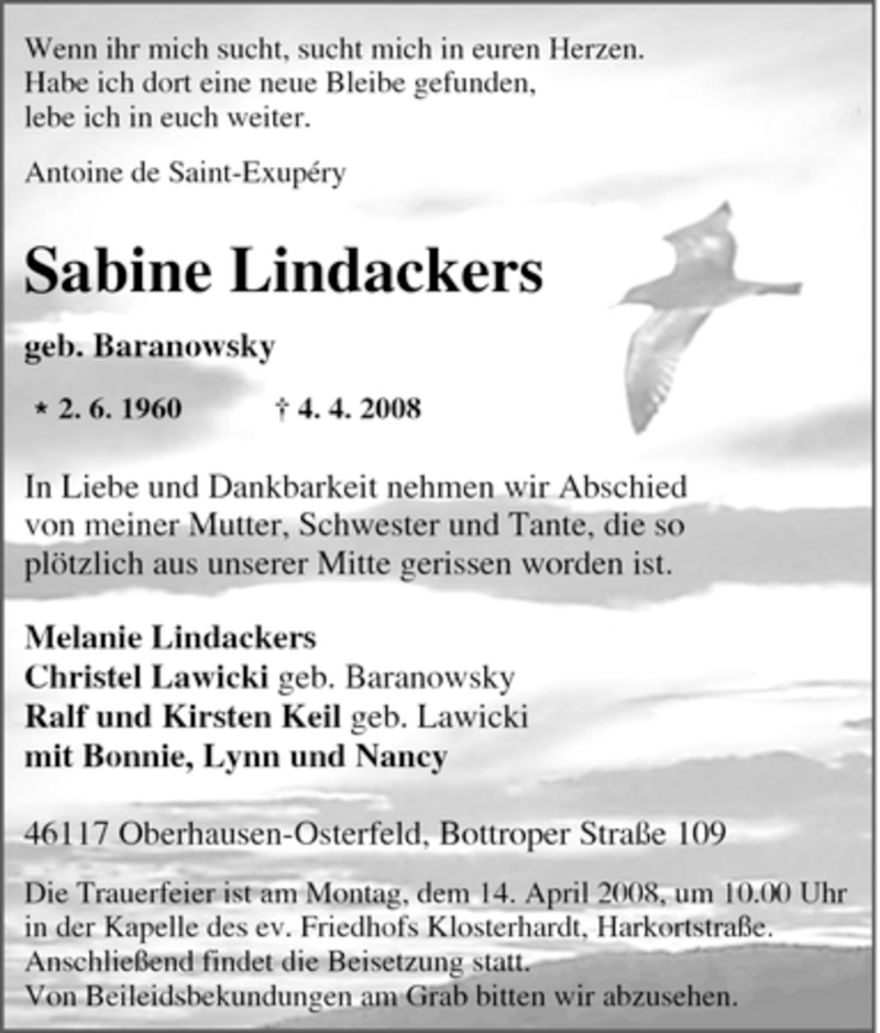 Hier finden Sie alle Traueranzeigen aus der Zeitung, die bisher für Sabine Lindackers erschienen sind. Weitere Traueranzeigen, die in der Zeitung erscheinen, werden hier ebenfalls aufgelistet