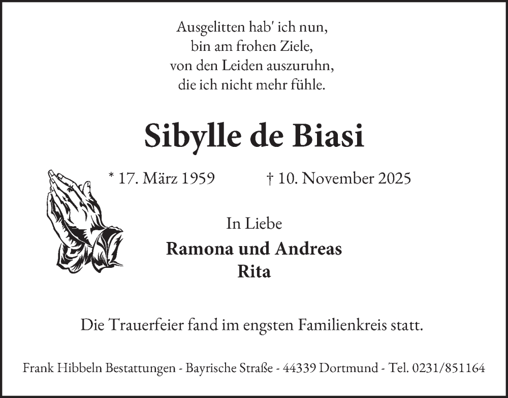 Hier finden Sie alle Traueranzeigen aus der Zeitung, die bisher für Sibylle de Biasi erschienen sind. Weitere Traueranzeigen, die in der Zeitung erscheinen, werden hier ebenfalls aufgelistet