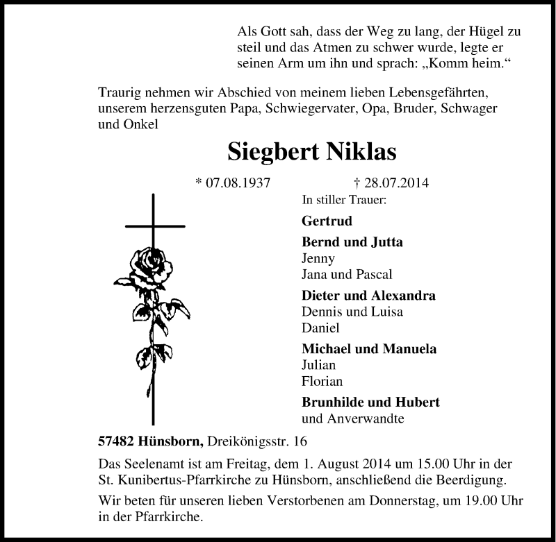 Hier finden Sie alle Traueranzeigen aus der Zeitung, die bisher für Siegbert Niklas erschienen sind. Weitere Traueranzeigen, die in der Zeitung erscheinen, werden hier ebenfalls aufgelistet