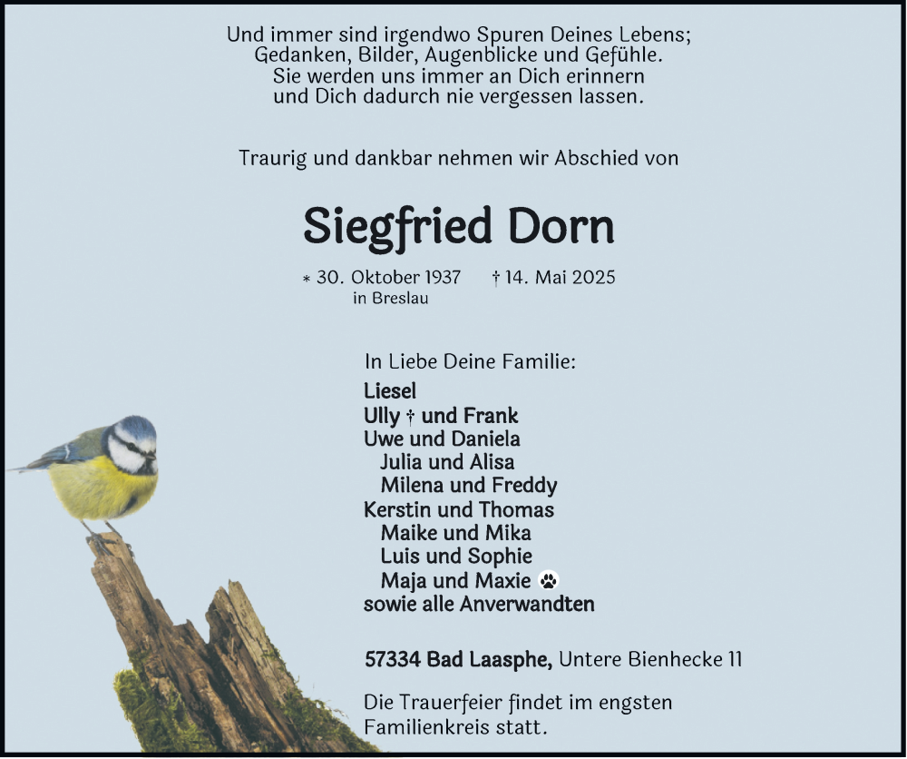 Hier finden Sie alle Traueranzeigen aus der Zeitung, die bisher für Siegfried Dorn erschienen sind. Weitere Traueranzeigen, die in der Zeitung erscheinen, werden hier ebenfalls aufgelistet