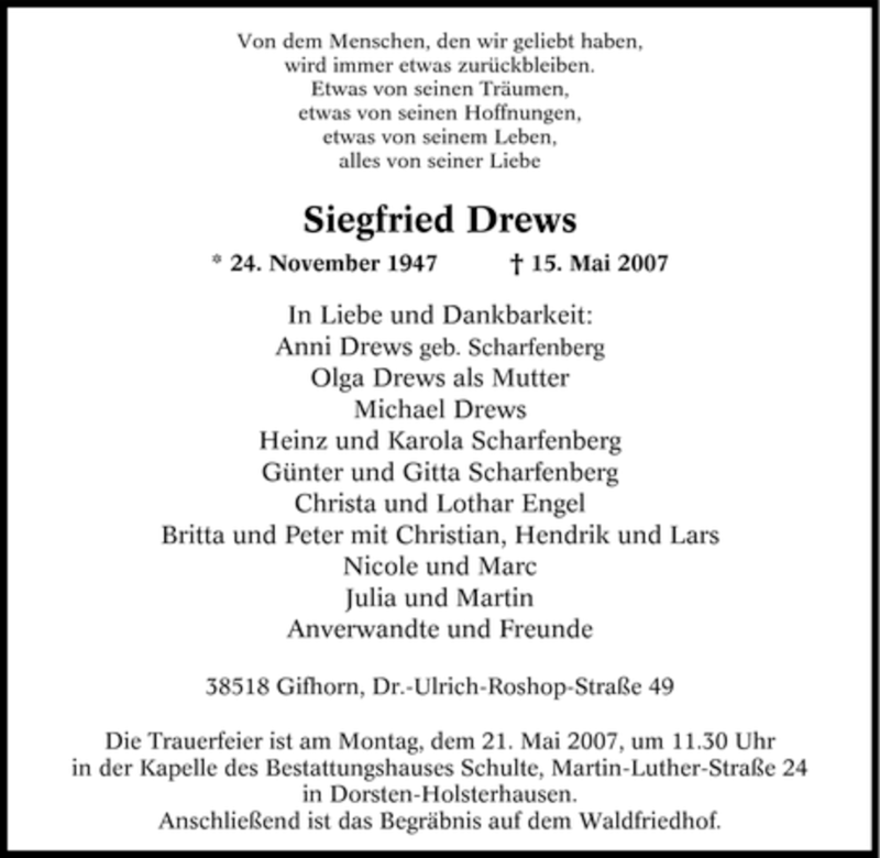Hier finden Sie alle Traueranzeigen aus der Zeitung, die bisher für Siegfried Drews erschienen sind. Weitere Traueranzeigen, die in der Zeitung erscheinen, werden hier ebenfalls aufgelistet