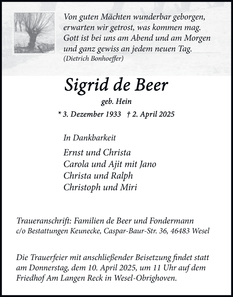 Hier finden Sie alle Traueranzeigen aus der Zeitung, die bisher für Sigrid de Beer erschienen sind. Weitere Traueranzeigen, die in der Zeitung erscheinen, werden hier ebenfalls aufgelistet