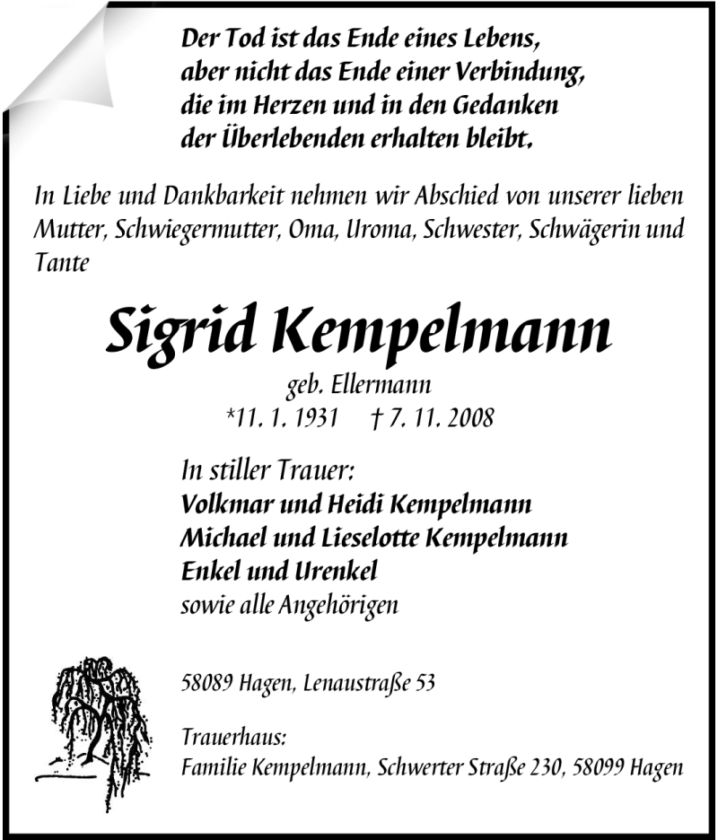 Hier finden Sie alle Traueranzeigen aus der Zeitung, die bisher für Sigrid Kempelmann erschienen sind. Weitere Traueranzeigen, die in der Zeitung erscheinen, werden hier ebenfalls aufgelistet