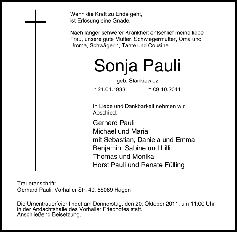 Hier finden Sie alle Traueranzeigen aus der Zeitung, die bisher für Sonja Pauli erschienen sind. Weitere Traueranzeigen, die in der Zeitung erscheinen, werden hier ebenfalls aufgelistet