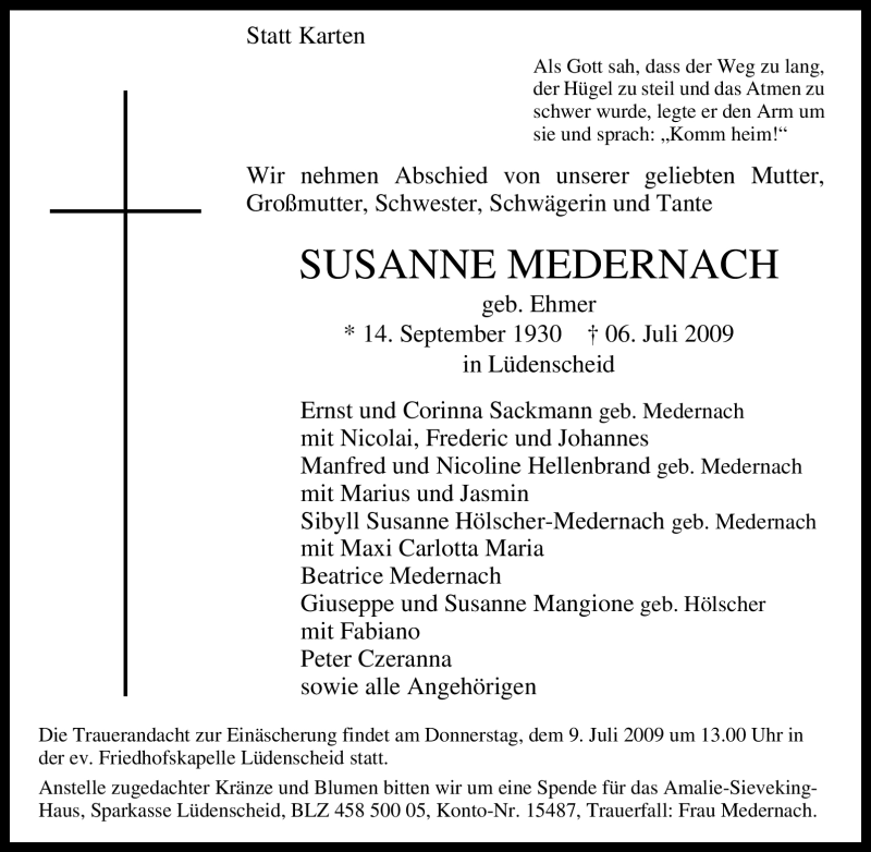 Hier finden Sie alle Traueranzeigen aus der Zeitung, die bisher für Susanne Medernach erschienen sind. Weitere Traueranzeigen, die in der Zeitung erscheinen, werden hier ebenfalls aufgelistet