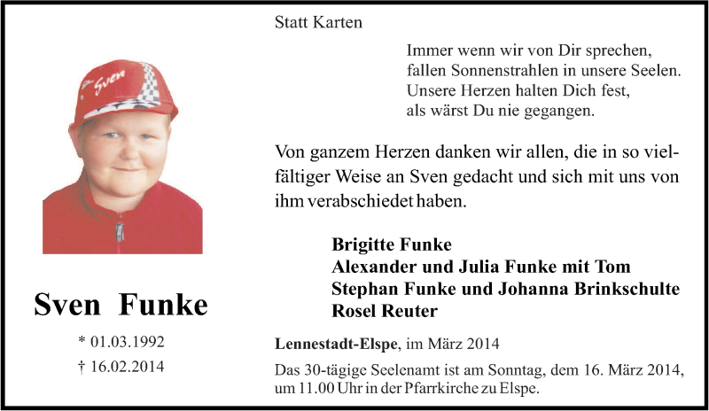 Hier finden Sie alle Traueranzeigen aus der Zeitung, die bisher für Sven Funke erschienen sind. Weitere Traueranzeigen, die in der Zeitung erscheinen, werden hier ebenfalls aufgelistet
